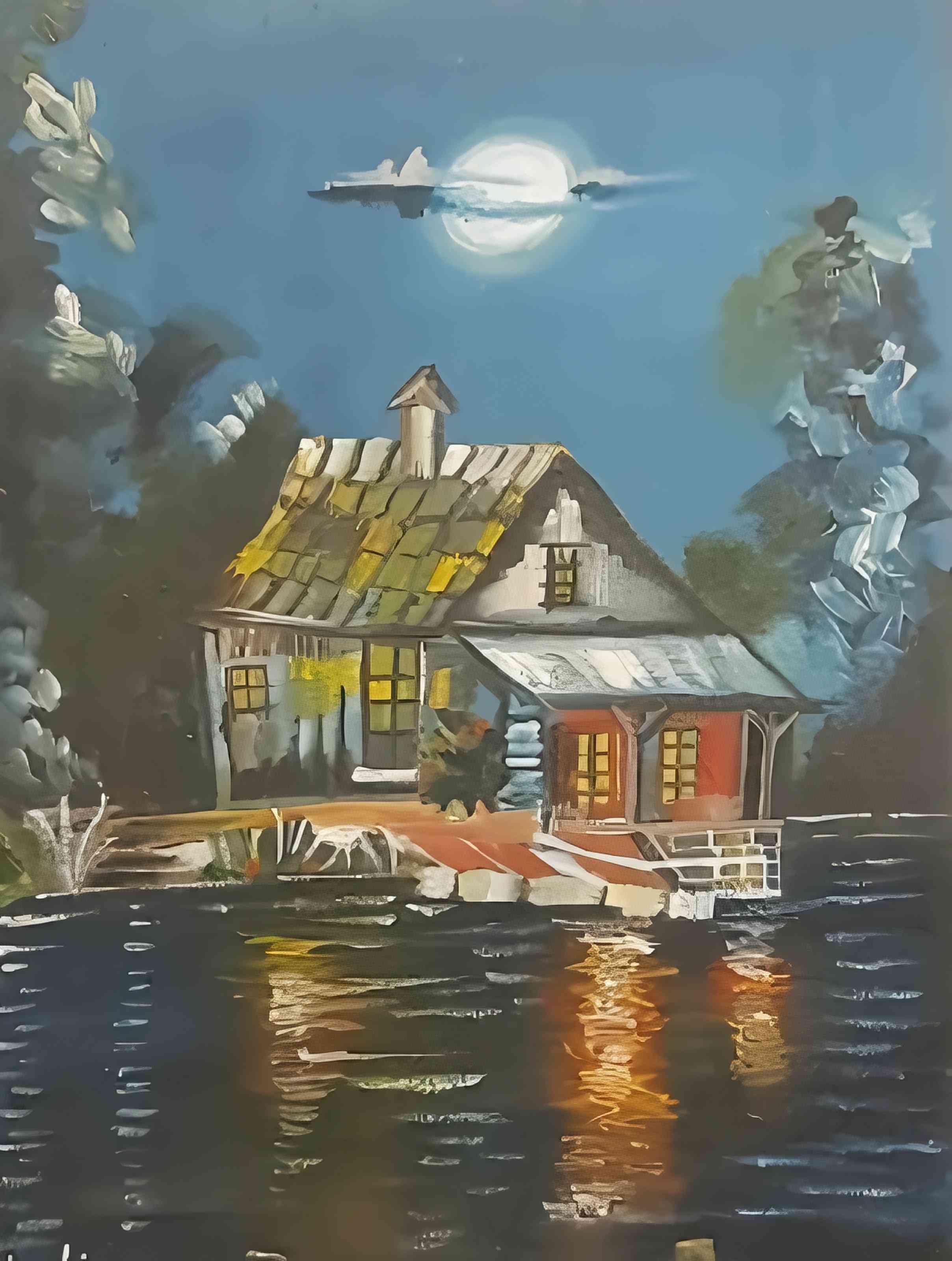Moonlit Reflections by the Rustic House