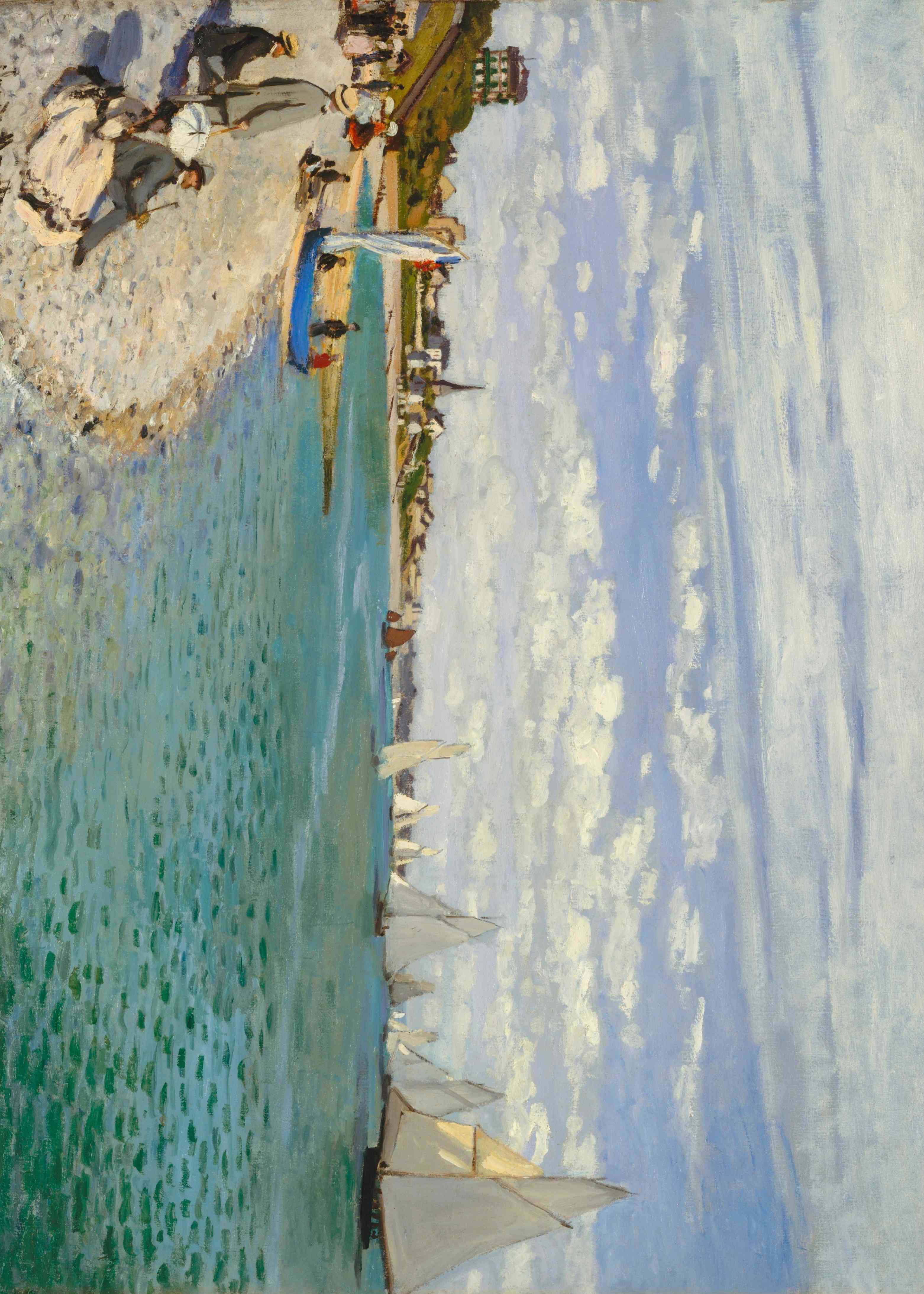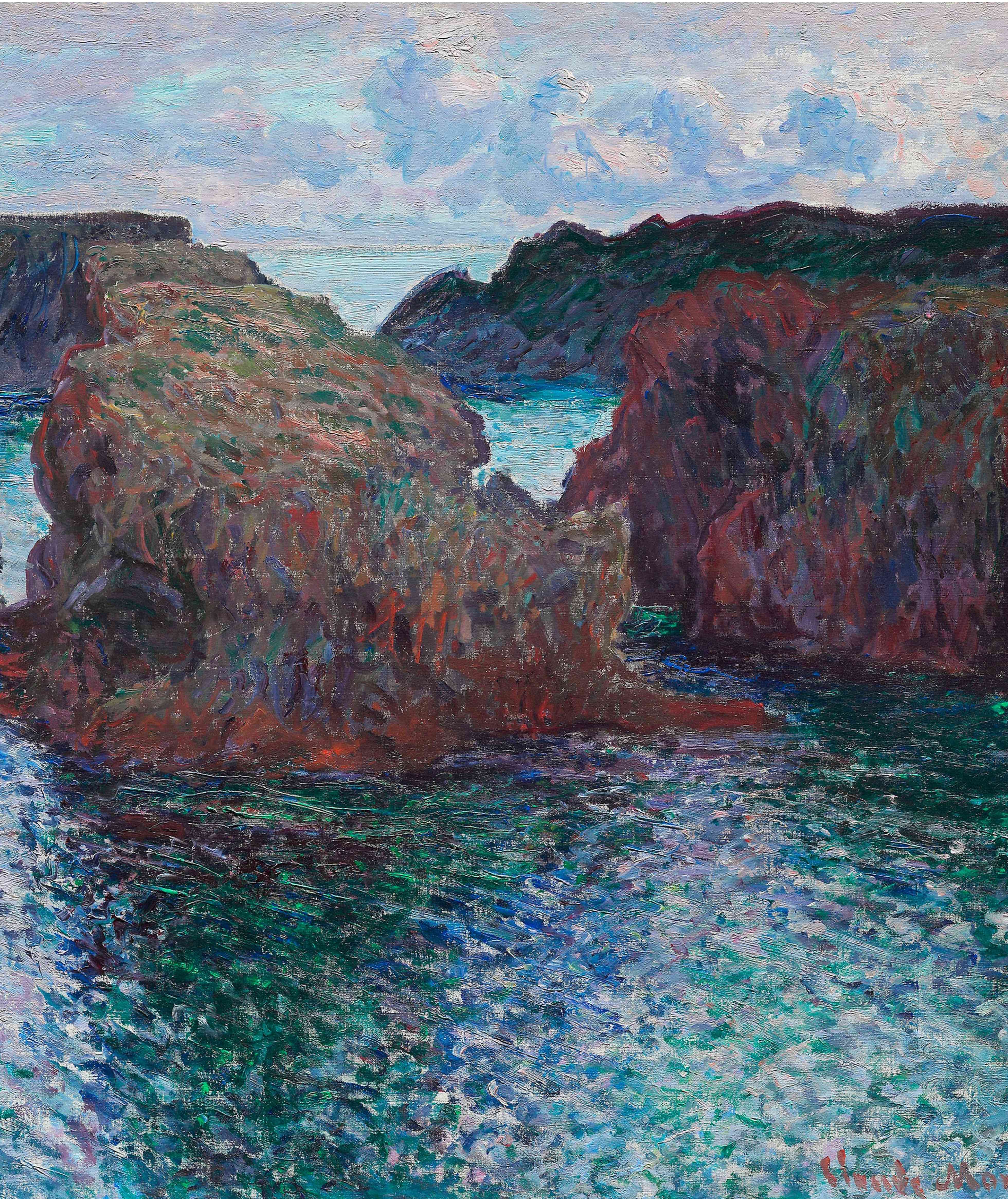 This dramatic painting captures the raw intensity of the sea during a thunderous storm. A sailing ship, with towering masts and torn sails, battles against violent waves rendered in shades of blue, white, and green.