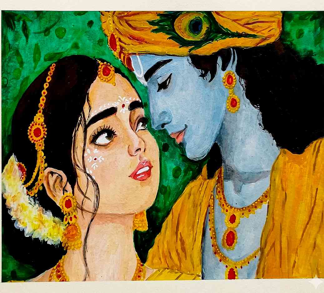 This expressive painting celebrates the elegance of Indian tradition through the portrait of a lady adorned in a vibrant saree. The red and yellow blouse, detailed with intricate patterns, is complemented by gold jewelry—earrings, necklace, and a bindi that highlights her cultural identity.