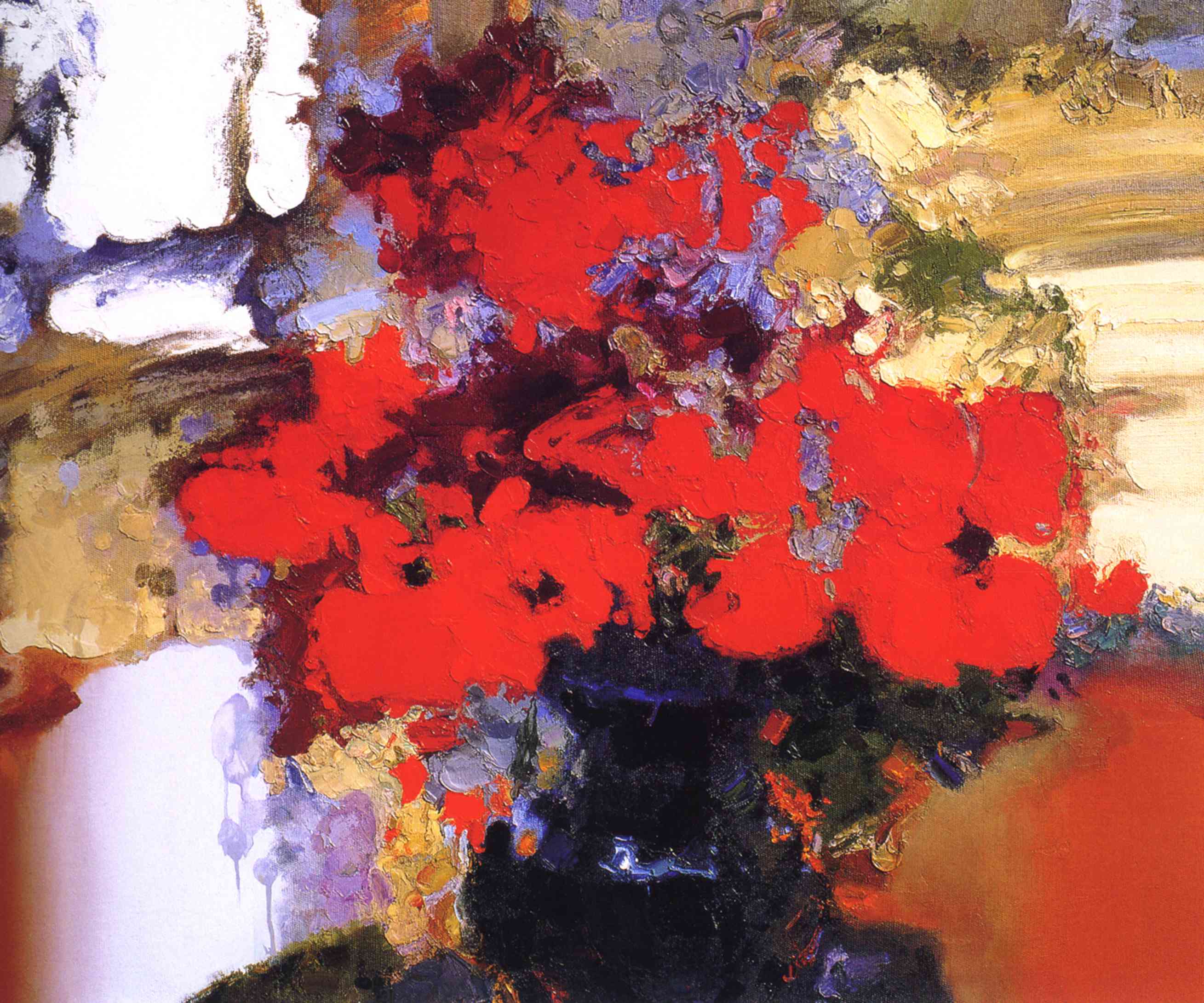 This enchanting painting captures the mysterious presence of a black cat peeking through a lush bouquet of vibrant flowers. With one striking yellow eye visible behind a large pink bloom, the feline’s gaze contrasts beautifully against the vivid palette of orange, yellow, purple, and pink blossoms.