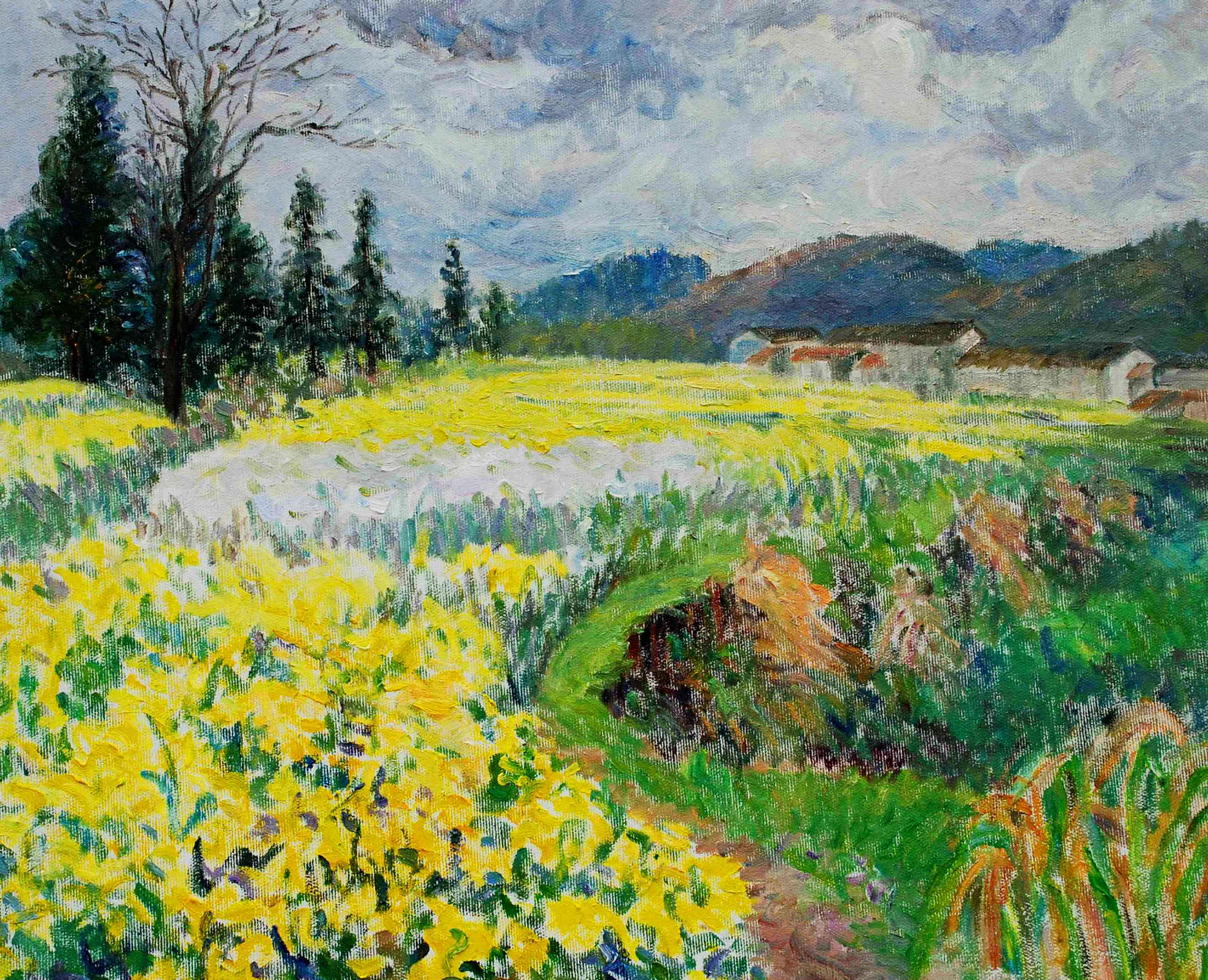 Colorful flowers swaying in the wind, the colorful sky casting its hue on them and making them sing. Bring home this cheerful painting and brighten up your décor!