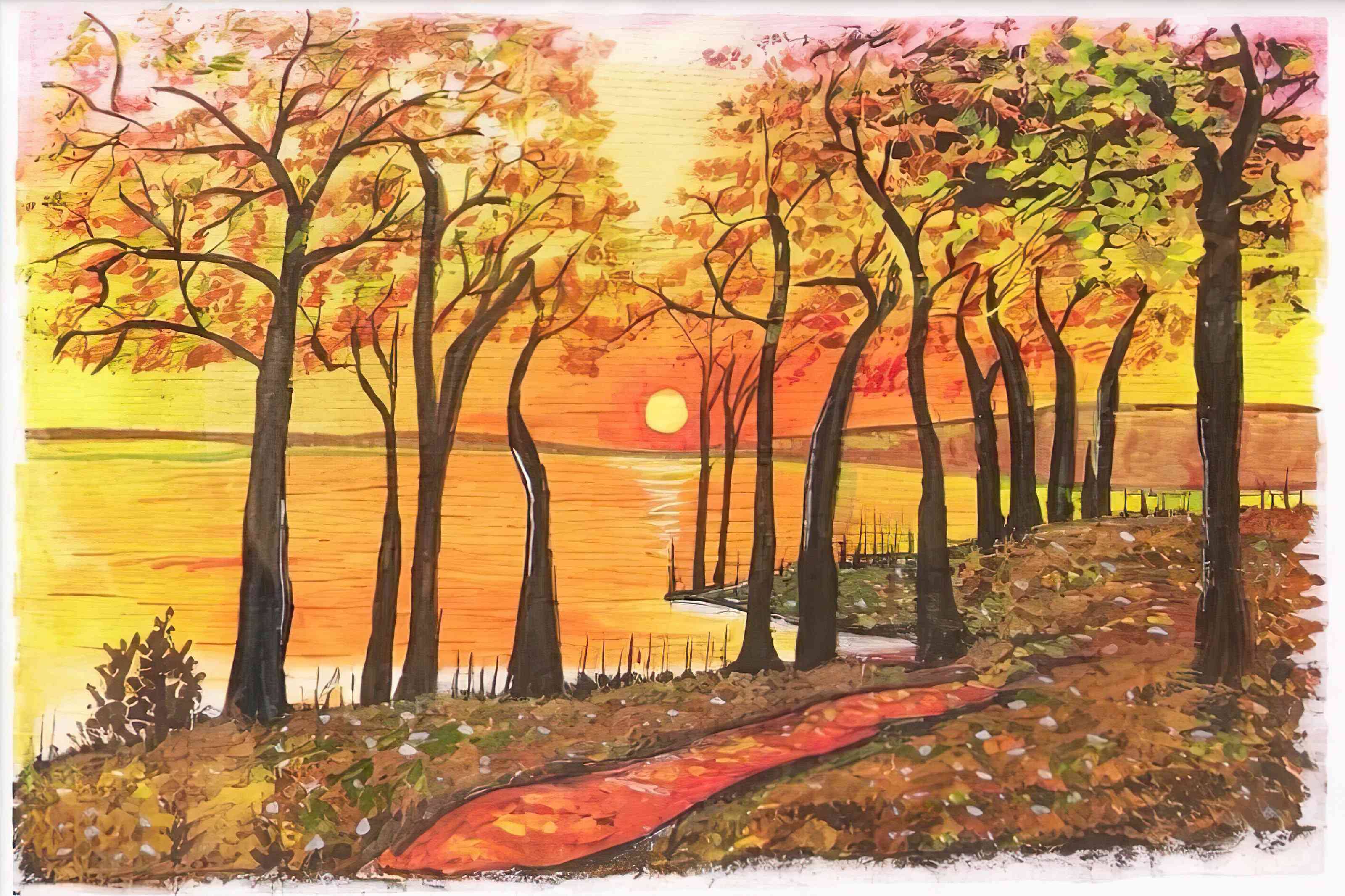Golden Birch Serenade is a vibrant celebration of the autumn season. The painting features a grove of slender white birch trees, their trunks rendered with a heavy impasto technique that adds a tactile, three-dimensional quality to the bark.