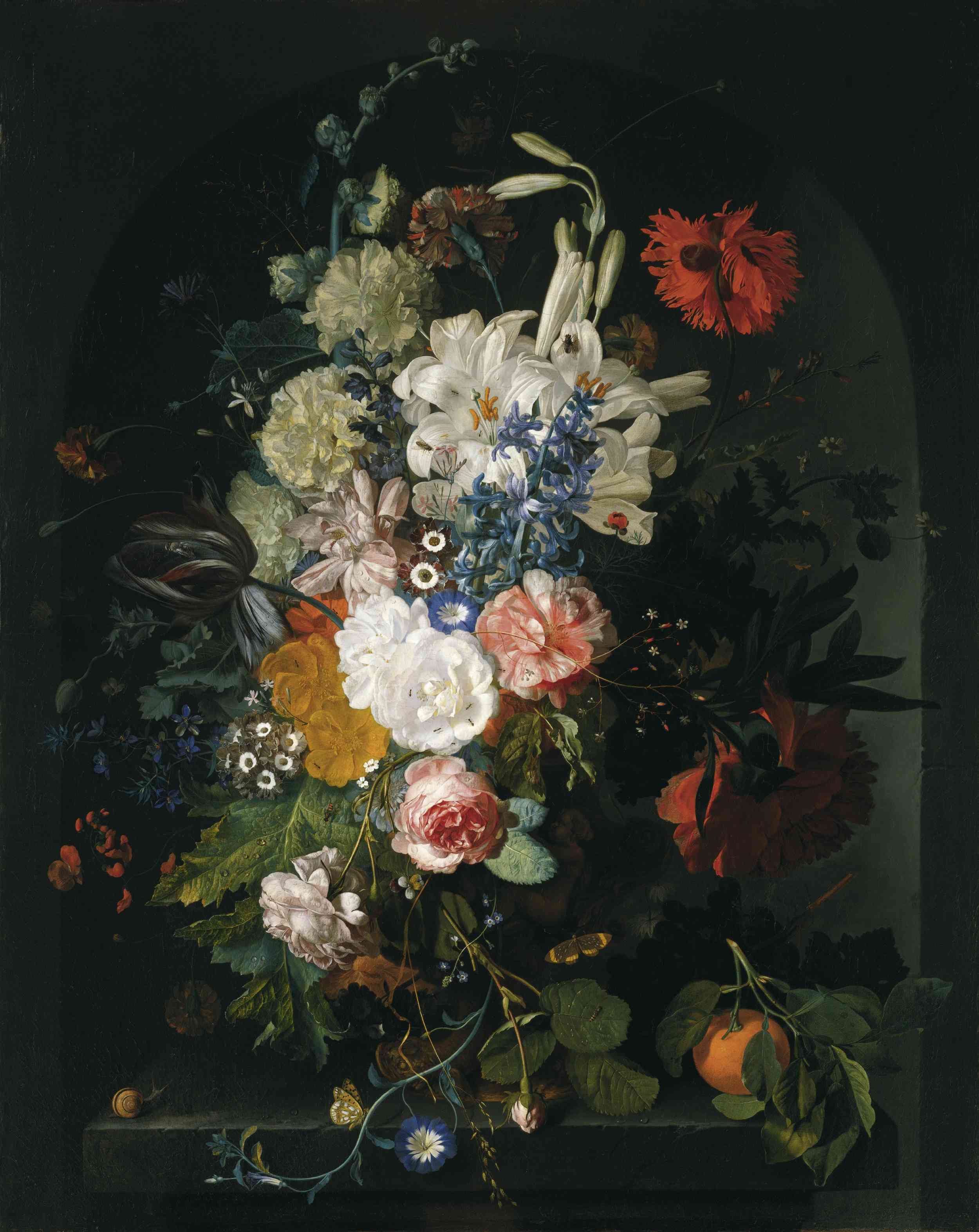 The painting, created around 1882, depicts a bouquet of various flowers in a clear crystal vase. The flowers, including roses, are in shades of white, pink, purple, and orange, set against a muted green background. The vase is partially transparent, showing the stems of the flowers inside. The painting is done in an impressionistic style, with visible brushstrokes and a focus on light and color.