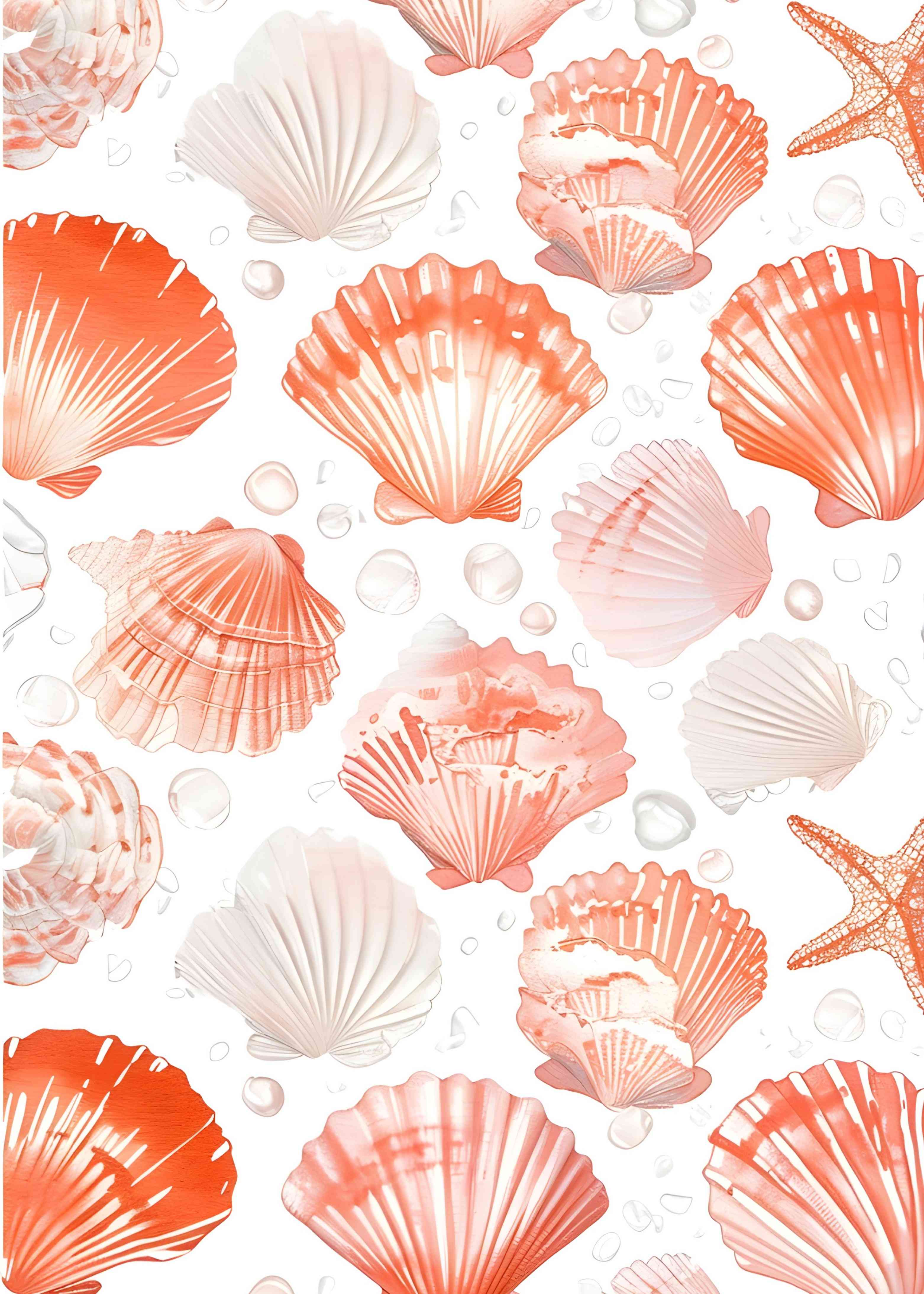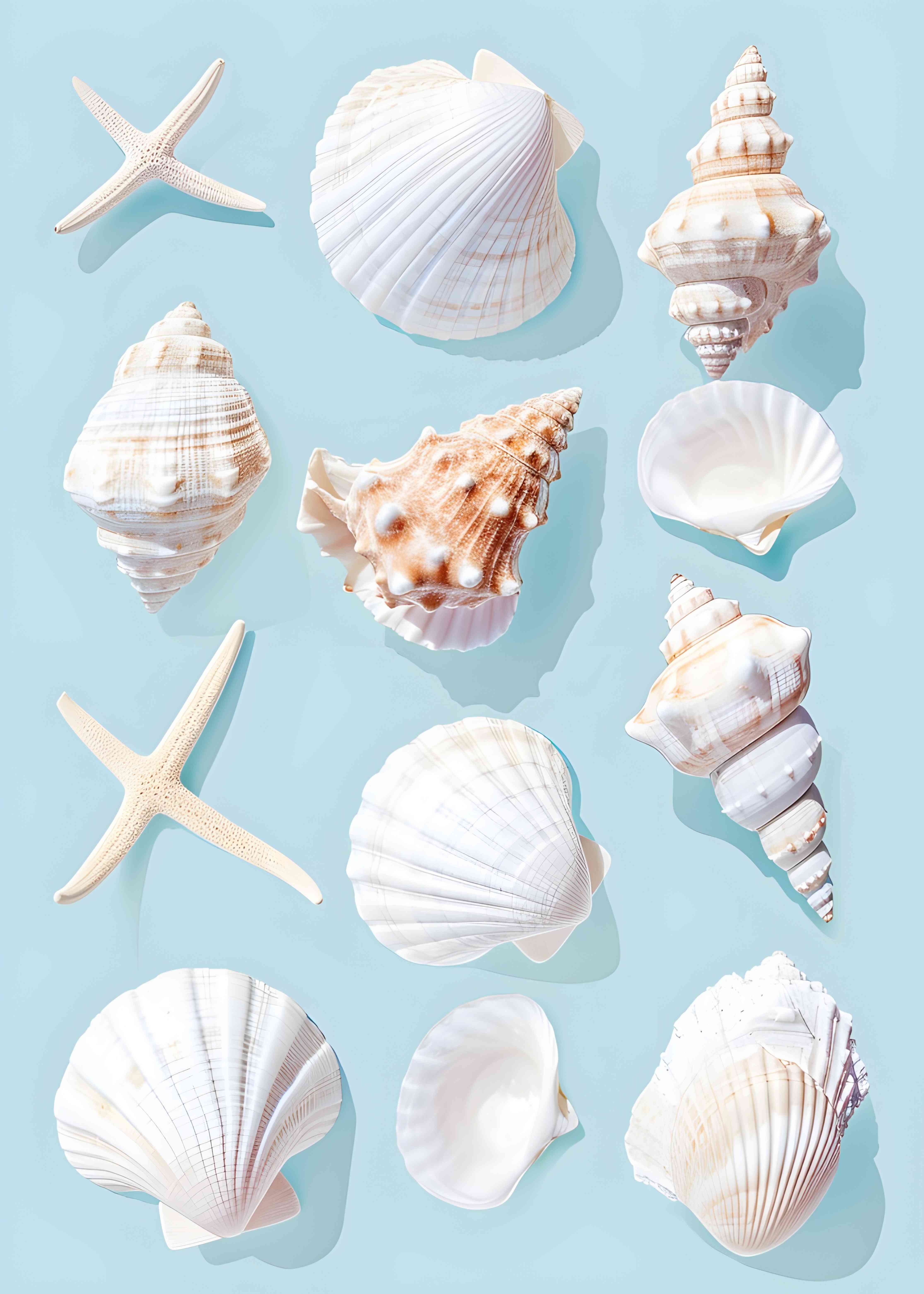 This watercolor artwork features starfish, seashells, coral, and seaweed in soft blue and beige tones. Delicate branching structures and organic shapes create a calm underwater scene, celebrating the beauty of marine life in a decorative style.
