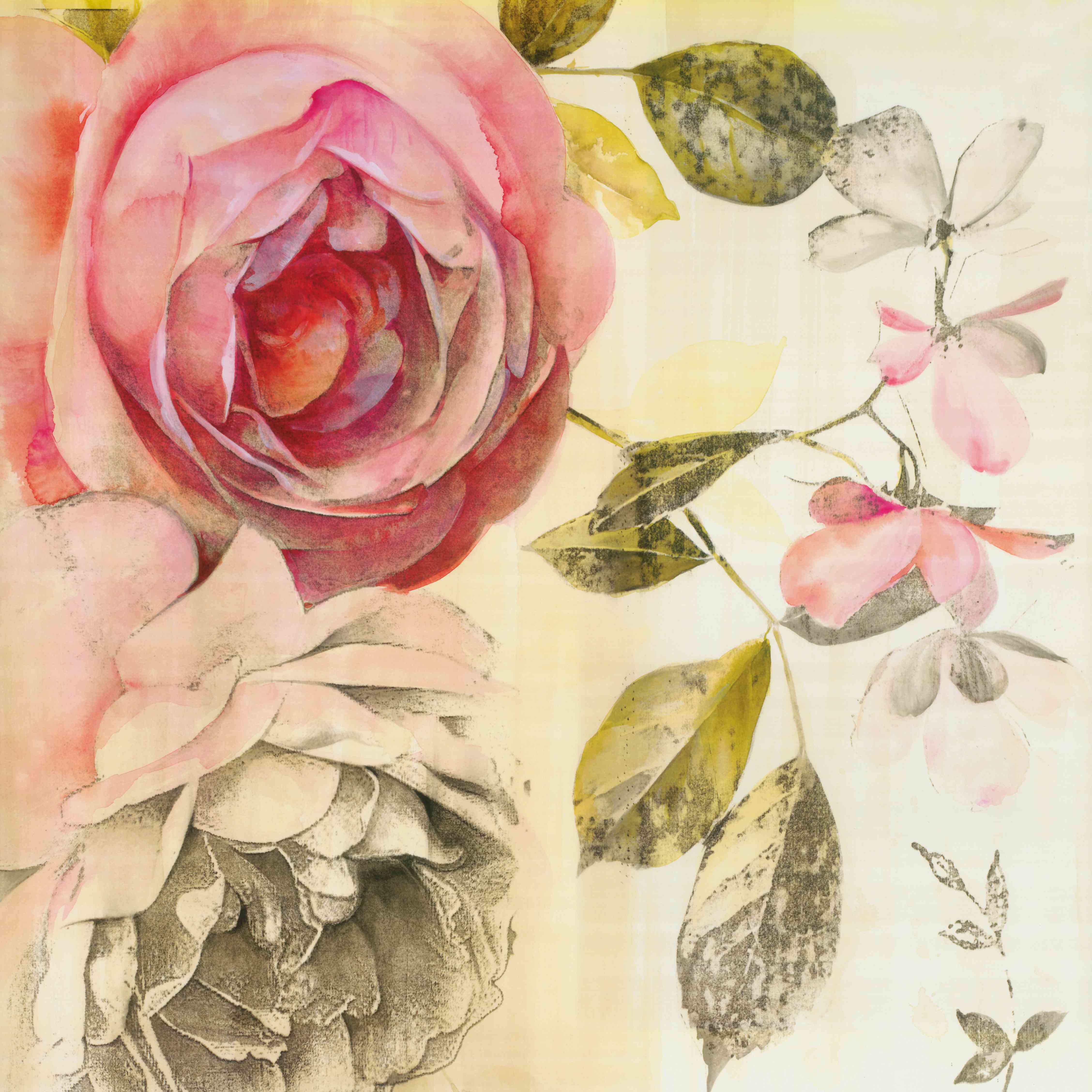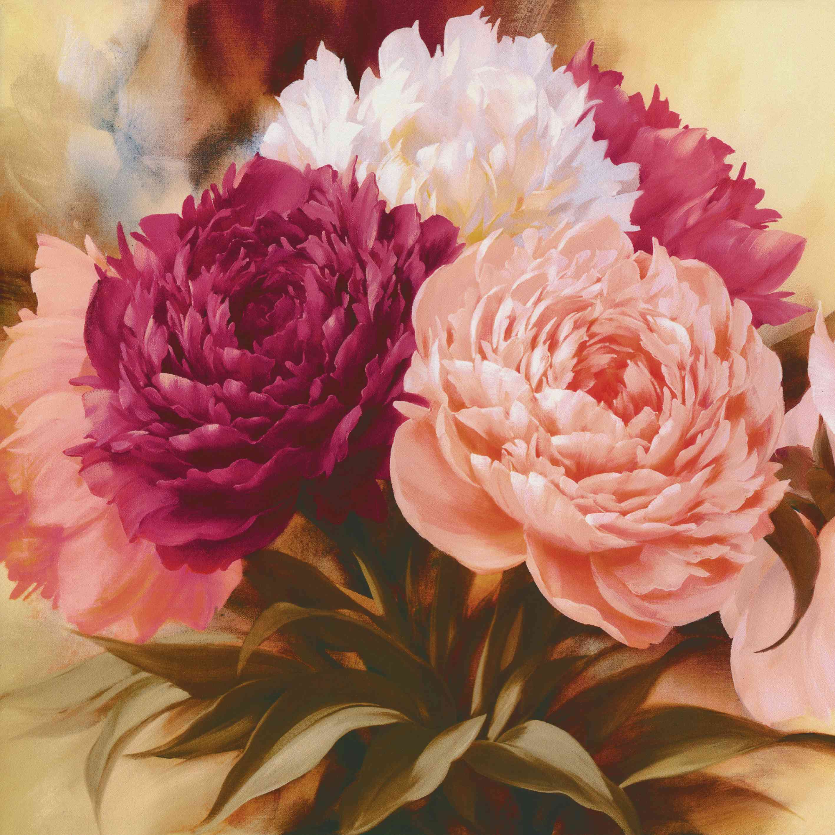 This exquisite square-format painting is a beautiful example of traditional Asian ink and wash technique. It features three large, vibrant pink peonies with intricate yellow centers, symbolizing prosperity and grace.