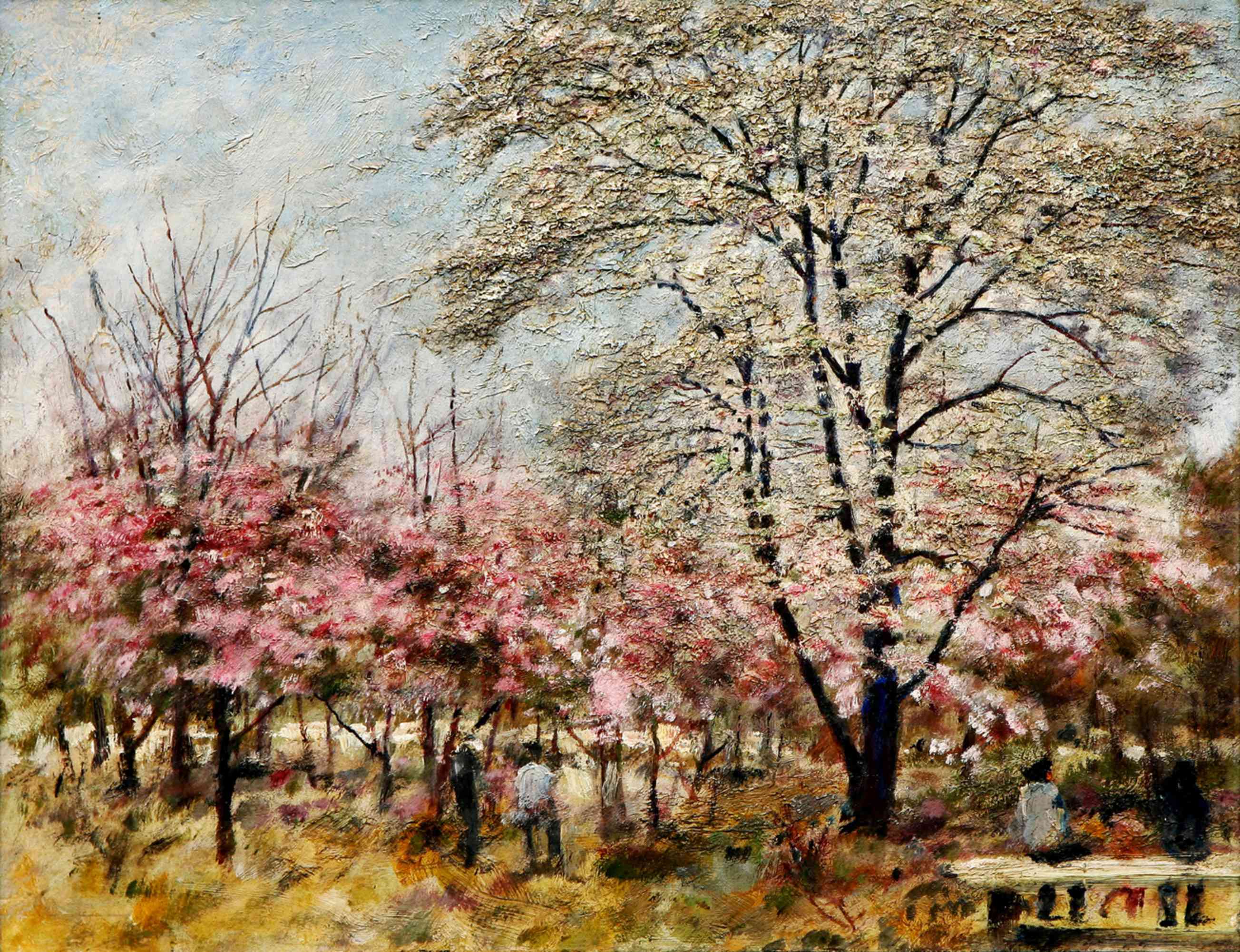 This striking oil painting depicts a vibrant, layered landscape where a sea of flowers meets a tranquil river. The artist utilizes a heavy palette knife impasto technique, creating a thick, three-dimensional texture that brings the foreground of fiery red and orange blooms to life.