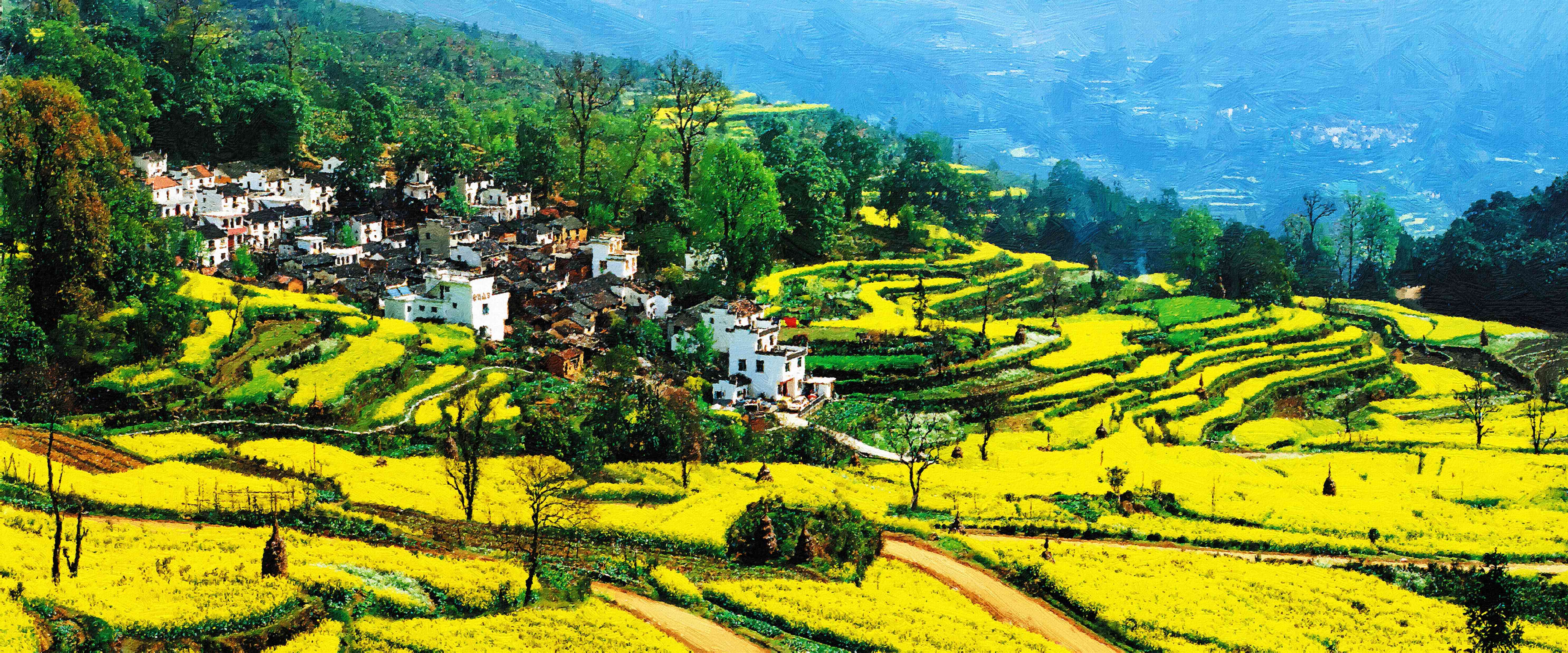 This stirring oil painting depicts a large, sun-drenched haystack sitting at the edge of a lush, green woodland. The artist utilizes a bold impasto technique, with thick, rhythmic brushstrokes that give the golden hay and the dense, leafy canopy a sculptural, vibrating quality.