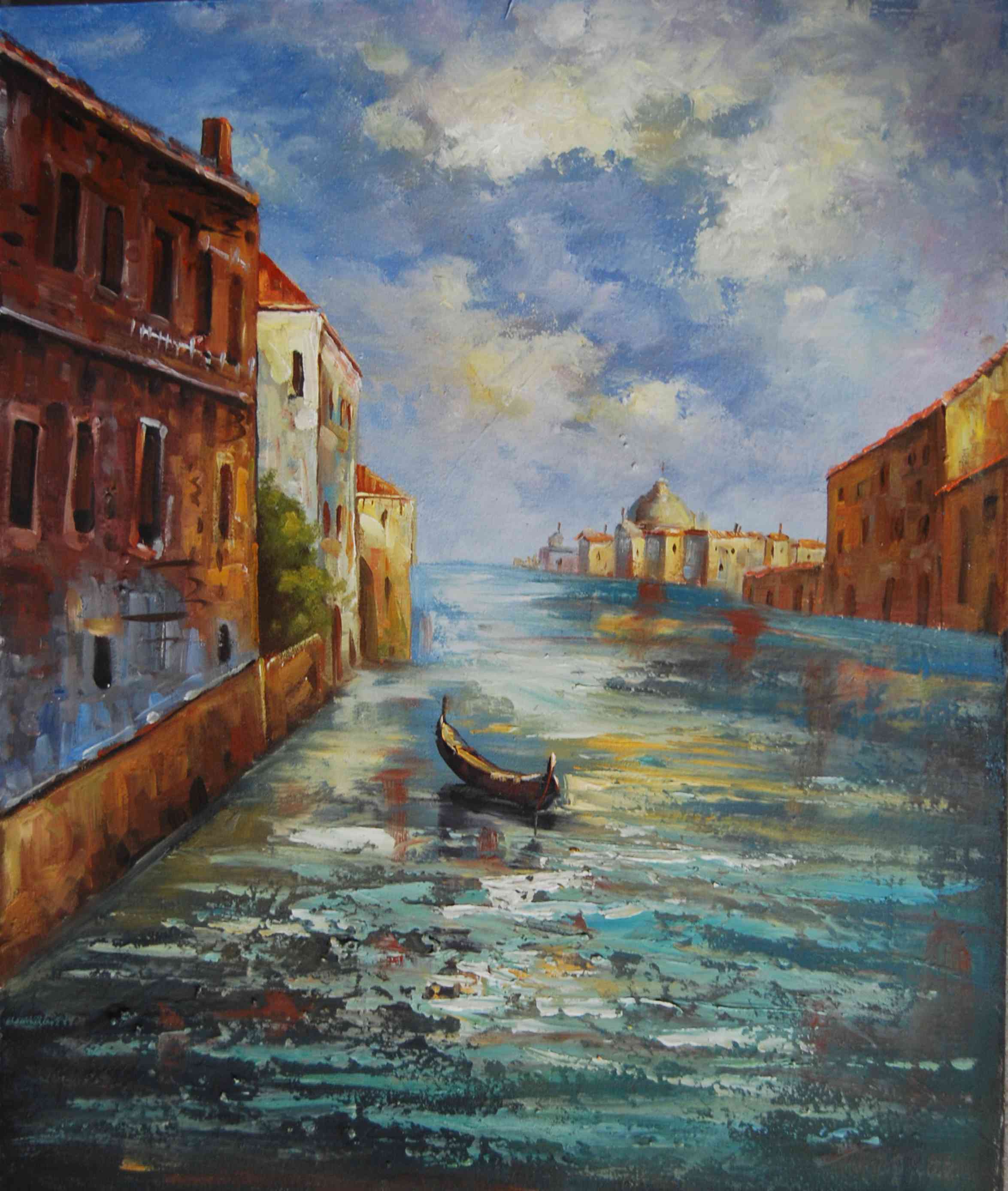 This expansive oil painting offers a panoramic view of the Grand Canal in Venice, rendered with the meticulous detail characteristic of the Canaletto tradition. On the right, the prominent pink-hued facade of a Venetian church stands as a focal point, its warm tones contrasted by the cool, glassy teal of the water.