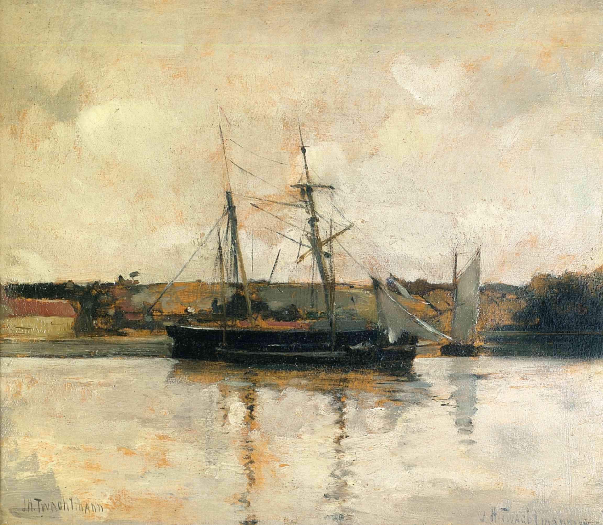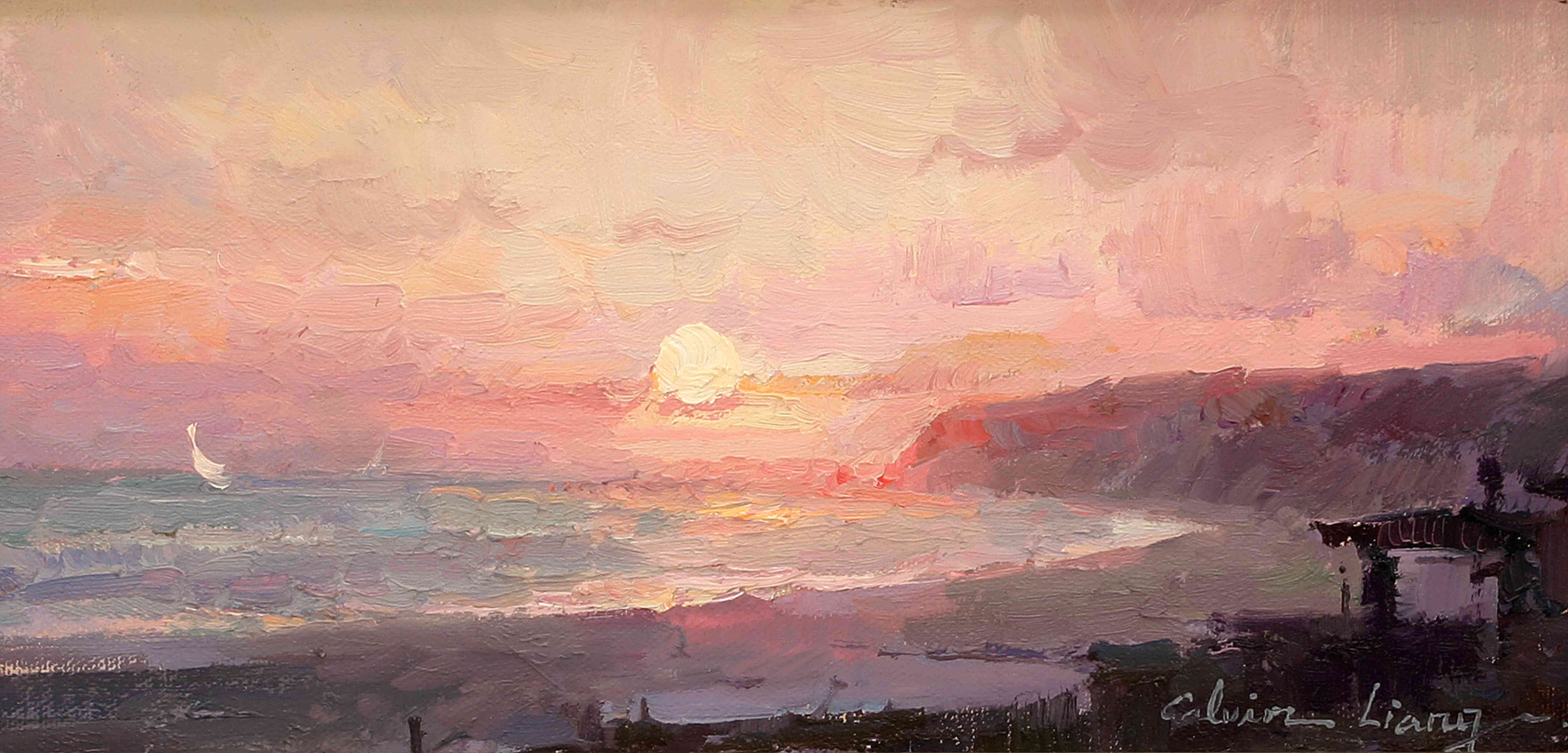 This luminous oil painting depicts a tranquil coastal scene at the height of a golden sunrise or sunset. The artist utilizes a warm, atmospheric palette, catching the precise moment when brilliant light bleaches the surface of the ocean into a shimmering silver-white.