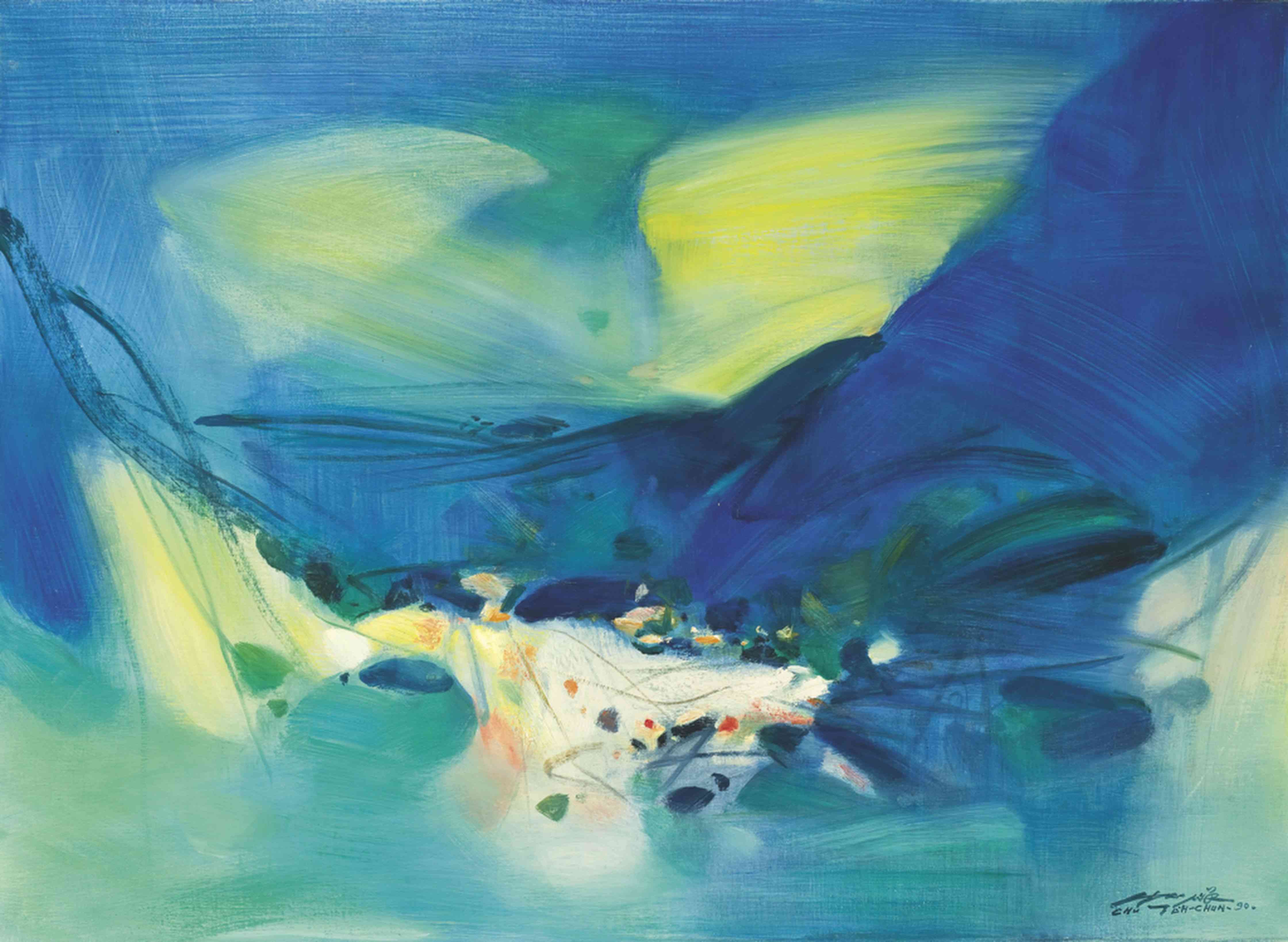 This striking artwork features a vibrant abstract composition set against a rich red background, punctuated by bold accents of yellow, green, and blue. Geometric shapes and dynamic color contrasts create a sense of movement and visual rhythm, drawing the viewer into a layered emotional experience. The piece radiates energy and complexity, making it a compelling addition to any modern art collection.